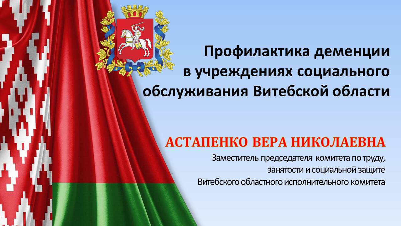 Заместитель председателя комитета по труду, занятости и социальной защите Витебского областного исполнительного комитета Вера Николаевна Астапенко приняла участие в 1-ой международной конференции по болезни Альцгеймера и деменции "Альцрус", в рамках которой ею освещена работа по профилактике деменции в учреждениях социального обслуживания Витебской области, а также основных аспектах научно-методического сотрудничества в данной сфере и инновациях в системе социального обслуживания области, перспективах развития.